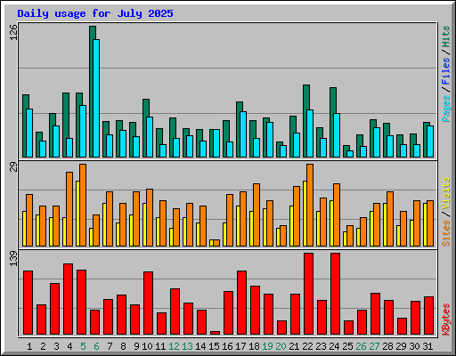 | Day | Hits | Files | Pages | Visits | Sites | KBytes | ||||||